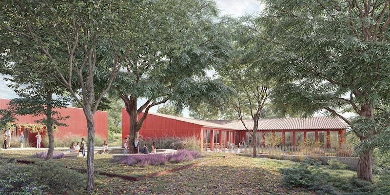 Les unités sont implantées à la lisière du bosquet d’arbres remarquables. La liaison avec les espaces environnants et la gestion des flux sont traitées avec le plus grand soin, avec la création d’une allée structurante Est-Ouest, le long d’une ligne de niveau. Cette desserte permet la livraison directe des repas depuis la cuisine du château et place l’espace de plein air au cœur des parcours quotidiens. Accessibles depuis l’allée plantée, les deux unités s’installent dans la pente avec des orientations opposées, profitant des bienfaits du site. Les vues, perspectives et transparences sont exploitées afin de révéler toute sa beauté.