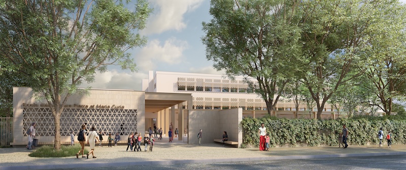 une enceinte végétale enveloppante, au droit de la clôture existante. Paré de brique claire, le projet propose une nouvelle image de l’école. Les volumes mesurés, les porches d’accueil généreux et le calepinage soigné des façades, présentent un édifice public identifiable et avenant, à échelle humaine. Fermant les cours, les extensions offrent une enceinte protectrice garantissant la sécurité et la surveillance des enfants. Protégé des regards, le groupe scolaire ménage des liens avec le quartier, par le biais de transparences subtiles au droit des claustras des rez-de chaussée.