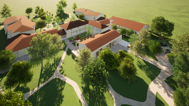 Créés à l’arrière du bâtiment existant, les extensions garantiront un chantier indépendant et autonome, limitant les nuisances pour les résidents. Depuis le Tiers-lieu, les vues, perspectives et transparences seront exploitées au Nord afin de révéler toute la beauté de cette zone du parc. Au Sud, il s’ouvrira largement sur une cour végétalisée, bénéficiant à la fois des apports solaires hivernaux et du couvert estival d’une pergola. Avec la maison d’origine, la cour formera le cœur de l’établissement. Les logements seront baignés de lumière naturelle avec de grands ouvrants donnant sur des balcons filants protégés par un débord de toit et des brise-soleils.